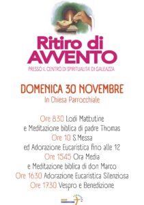 Con l’inizio dell’Avvento sempre la nostra Comunità si mette in cammino con un passo più deciso. Lo facciamo con il Ritiro del 30 Novembre a Galeazza con la possibilità di vivere un intero giorno insieme o solo una delle due parti. Ecco tutti gli orari utili: