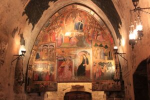 All’interno della basilica, poco distante dalla Porziuncola, si trova la Cappella del Transito, ricavata nell’antica infermeria del primo convento. Qui Francesco trascorse gli ultimi giorni della sua vita, gravemente provato dalla malattia e quasi cieco.