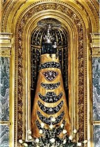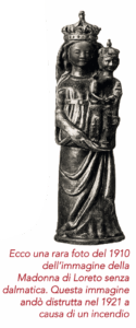 Fin dal XVI sec. la Modonna di Loreto è avvolta da una dalmatica bianca decorata di gioielli ma soprattutto ha il volto scuro come antichissime icone a cui la devozione della gente offriva ceri e lumini …che nel tempo inscurivano l’immagine!