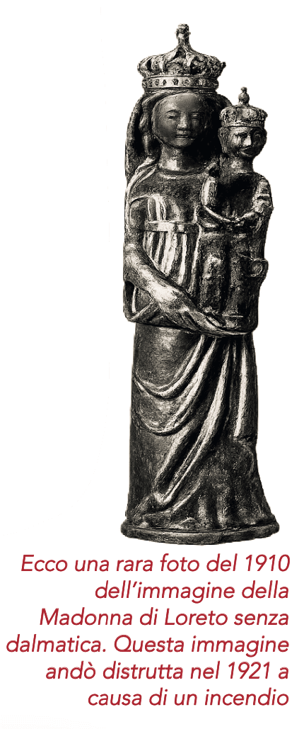 Fin dal XVI sec. la Modonna di Loreto è avvolta da una dalmatica bianca decorata di gioielli ma soprattutto ha il volto scuro come antichissime icone a cui la devozione della gente offriva ceri e lumini …che nel tempo inscurivano l’immagine!